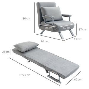 TWO-IN-ONE DESIGN: Transforms from a single chair to a sofa bed - an excellent space saver for smaller spaces. Ideal for when visitors stay overnight, giving them somewhere proper to rest.ADJUSTABLE BACK: Can be set to five different positions, allowing you to find the perfect shape which supports you as you rest and sleep.STEEL FRAME: A solid structure which supports your body when in use. Four angled legs to keep the balance. SPONGE PADDING: Thickly filled, ensures you'll be sitting comfortably. Also comes with cushion for extra comfort and support.SUEDETTE UPHOLSTERY: Making the foldable bed soft to the touch and create a stylish look.FOLDING CHAIR BED DIMENSIONS: Chair: 80H x 65W x 69Dcm. Bed: 25H x 185.5L x 60Wcm. MAXIMUM LOAD 100KG. ASSEMBLY REQUIRED.